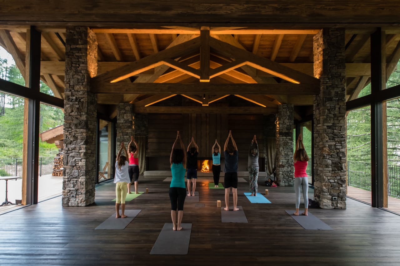 La grande sala vetrata dell’hotel, aperta sui prati e le montagne, sarà la nostra sala yoga, dove la natura sarà la nostra compagna di pratica.